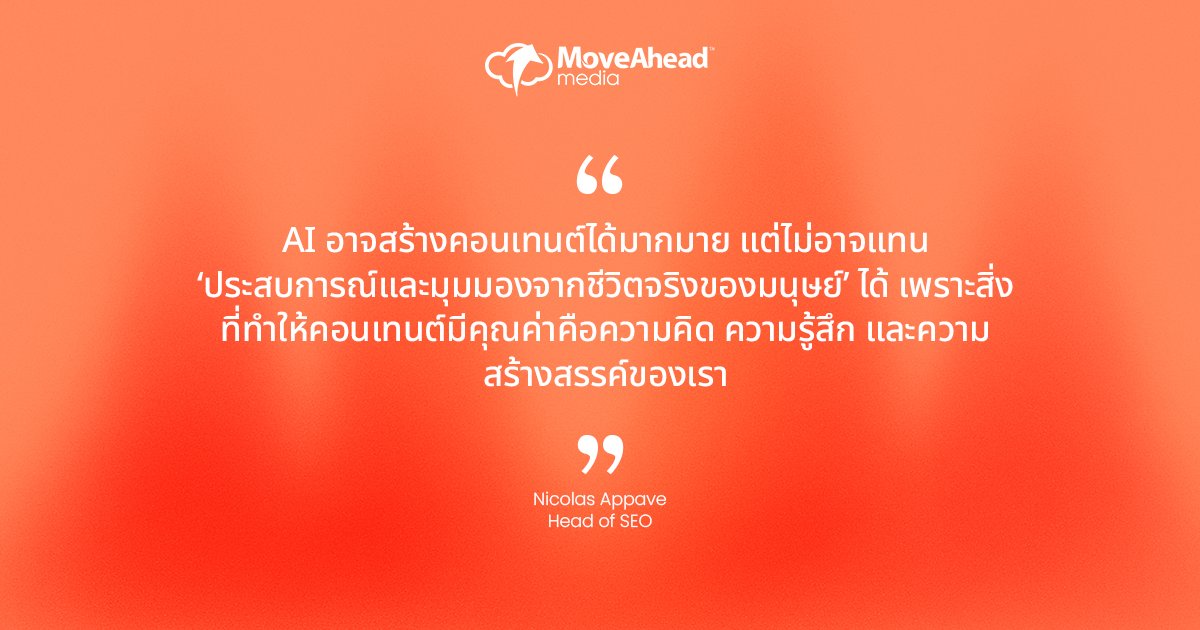 ท้ายที่สุดแล้ว ทั้งสามกลยุทธ์นี้แสดงให้เห็นถึงความจริงที่ว่า แม้ AI จะเปลี่ยนวงการการตลาดไปอย่างมาก แต่มันไม่ใช่ภัยคุกคามอย่างที่หลายคนคิด Nick หัวหน้าแผนก SEO ของเรา อธิบายเรื่องนี้ได้ดีมาก “AI เก่งในการผลิตคอนเทนต์จำนวนมาก แต่สิ่งที่ AI ไม่มีคือ ‘ประสบการณ์ชีวิตที่สดใหม่’”